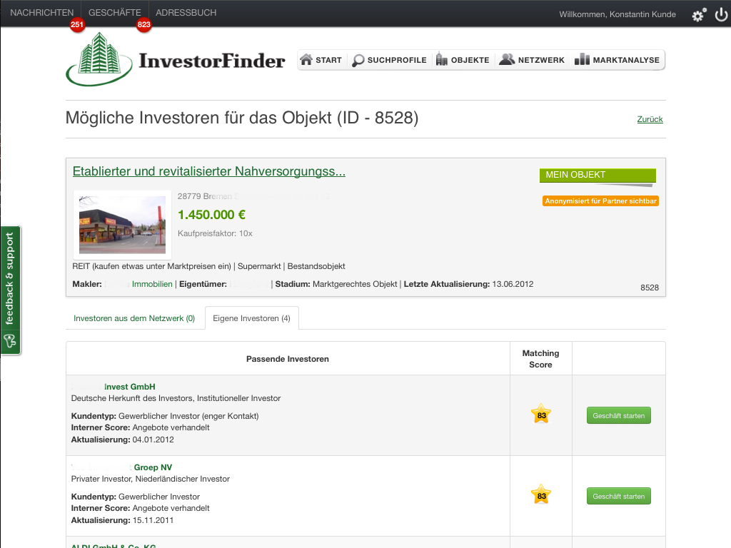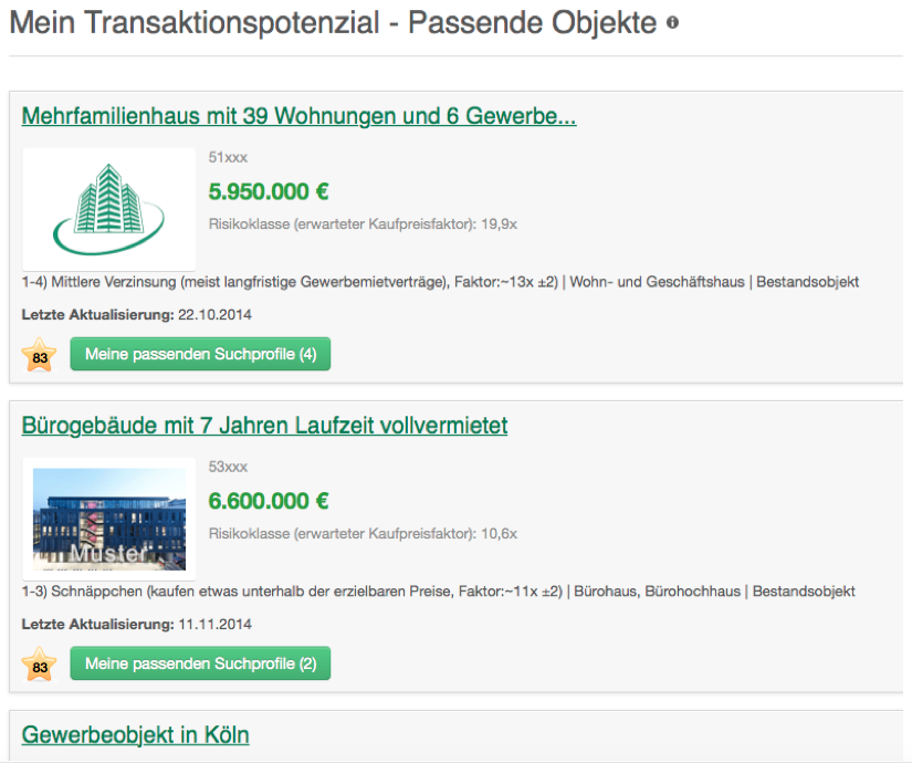 Nutzen Sie unseren neuartigen Suchalgorithmus für die Suche sowohl nach passenden Objekten für Investoren oder Mieter als auch passenden Investoren und Mietern für Ihre Objekte. In sekundenschnelle können Sie sehen ob ein Angebot sinnvoll ist. Erhöhen Sie damit Ihre Professionalität im Immobilienmarkt.