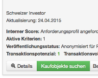 Sie starten eine Transaktion durch eine kostenlose Anmeldung und durch Eintrag eines zu verkaufenden Objekts oder eines Suchprofils für sich selbst und einen Endinvestor. Dann klicken Sie einfach auf das grüne Suchfeld und sehen, wie viele Investoren oder Objekte passen.